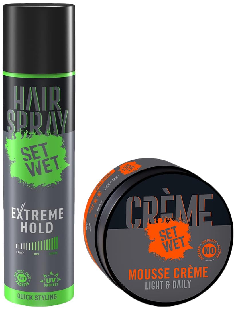The Set Wet Hair Spray for men-Extreme Hold sets your hairstyle so that no strand is out of place. Just spray the Set Wet Extreme Hold Hair Spray and look sada sexy. This Set Wet Extreme Hold Hair Spray for men is non-sticky and sets your hair in place without weighing it down. When used after styling with gel, wax, clay or pomade, the Set Wet Extreme Hold Hair Spray gives an extra strong hold to maintain your hairstyle all day long. The Set Wet Extreme Hold Hair Spray contains only sexiness & no harmful chemicals that harm your hair. Free of all baddies like paraben, sulphate, mineral oil, petrolatum, formaldehyde, DEA, SLS, and SLES. Style your hair, then spray it on before you head out for a date, a chill Friday evening, a dinner date or even a dance party. It's all you need to keep your confidence high and sexy. This Set Wet Extreme Hold Hair Spray can be easily combed or washed off without the need of a shampoo and is ideal for men with straight, wavy or curly hair.