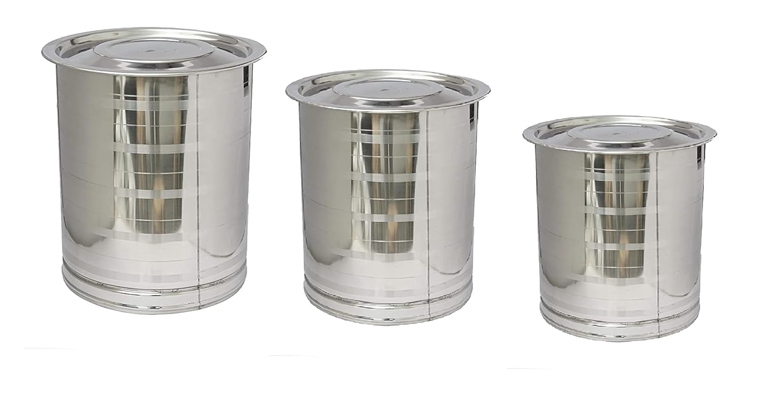 Stainless Steel Atta Tanki Or Container, Box, Drum, Pawali, Tanki With Lid 22 No.+24 No.+26 No. | Silver Stainless Steel Atta Drum - Set Of 3