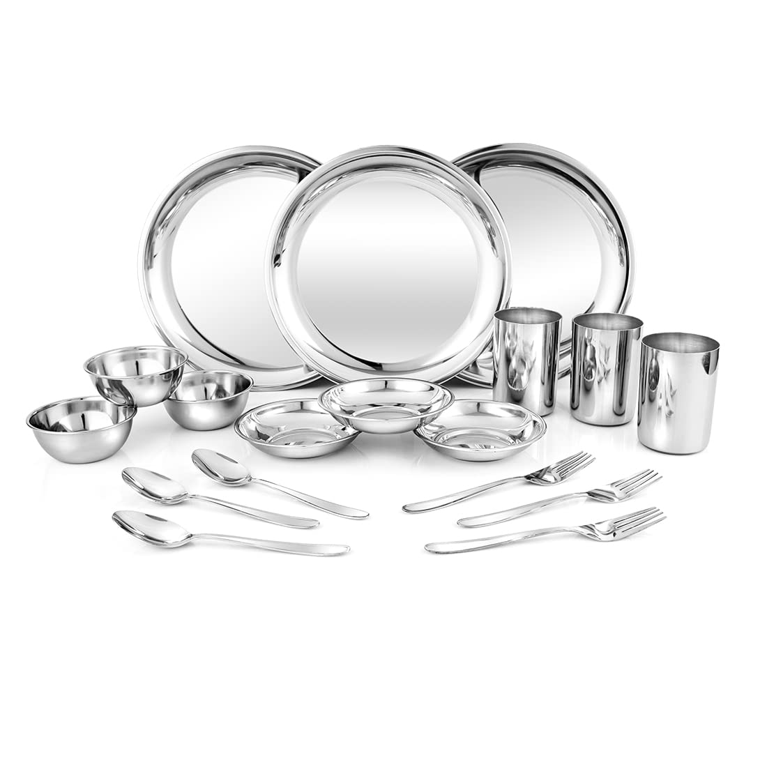 Stainless Steel Delight Solid Dinner Set Of 18 Pieces, Silver | 3 Dinner Plates+ 3 Glasses+ 3 Bowls+ 3 Pudding Bowls+ 3 Dessert Spoons+ 3 Dessert Forks