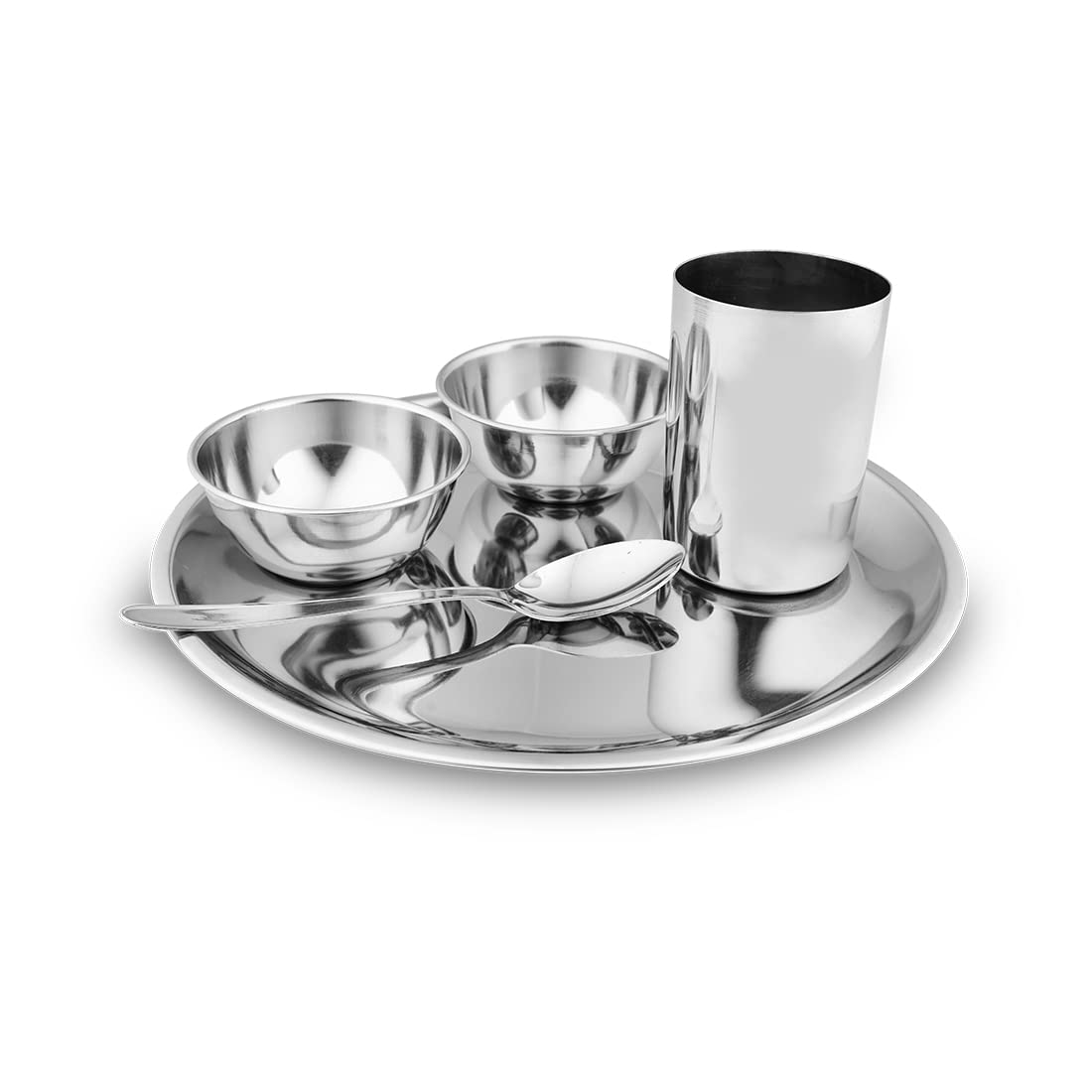 Stainless Steel Delight Solid Dinner Set Of 5 Pieces, Silver | 1 Dinner Plate+ 1 Glass+ 2 Bowls+ 1 Dessert Spoon