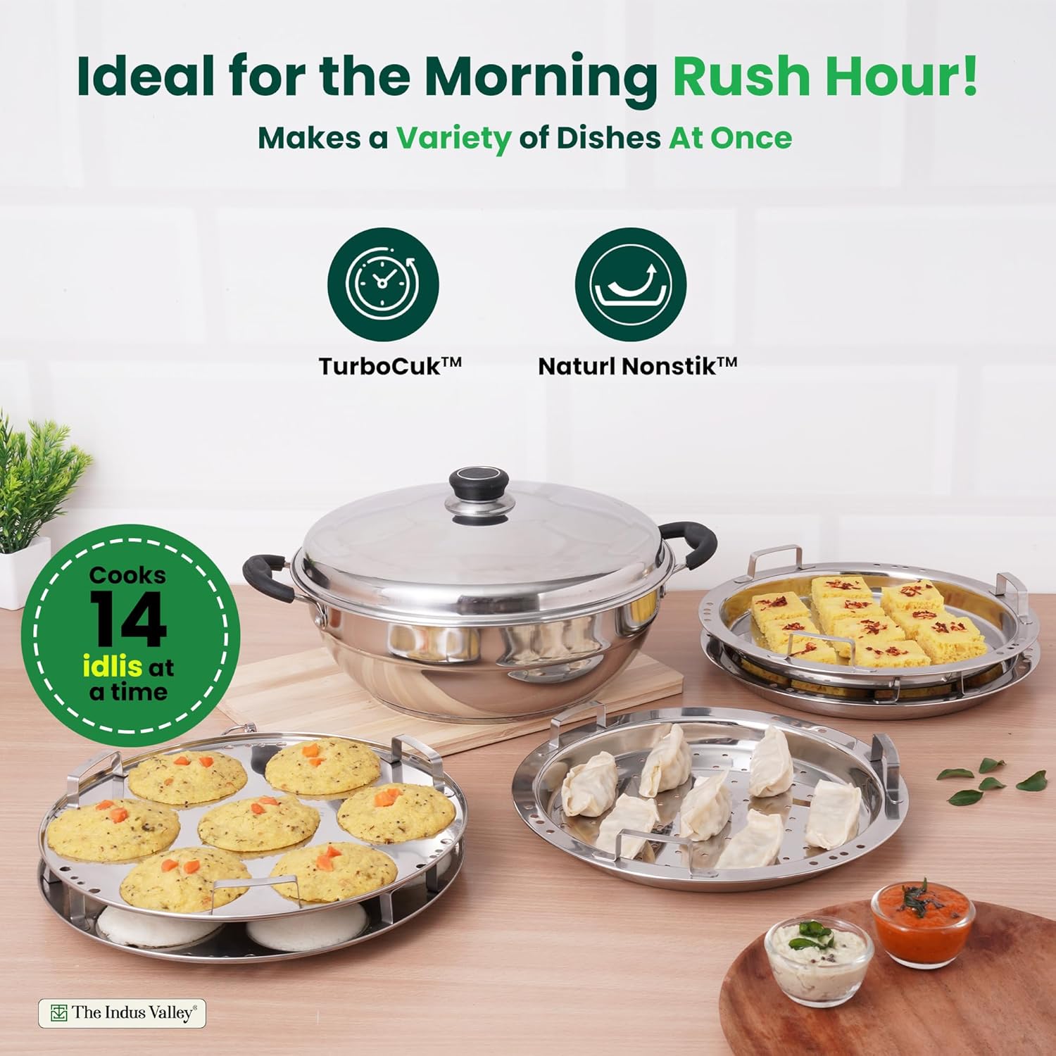 Stainless Steel Idli Maker, Dhokla Maker, Momo Maker - Multi Pot & Steaming Set | Large, 5 Plates, 29cm 11.3 Inch, 4.2 Liters, 1.5kg | Nonstick 3-layer Bottom | Induction Friendly, 100% Pure & Toxin-free