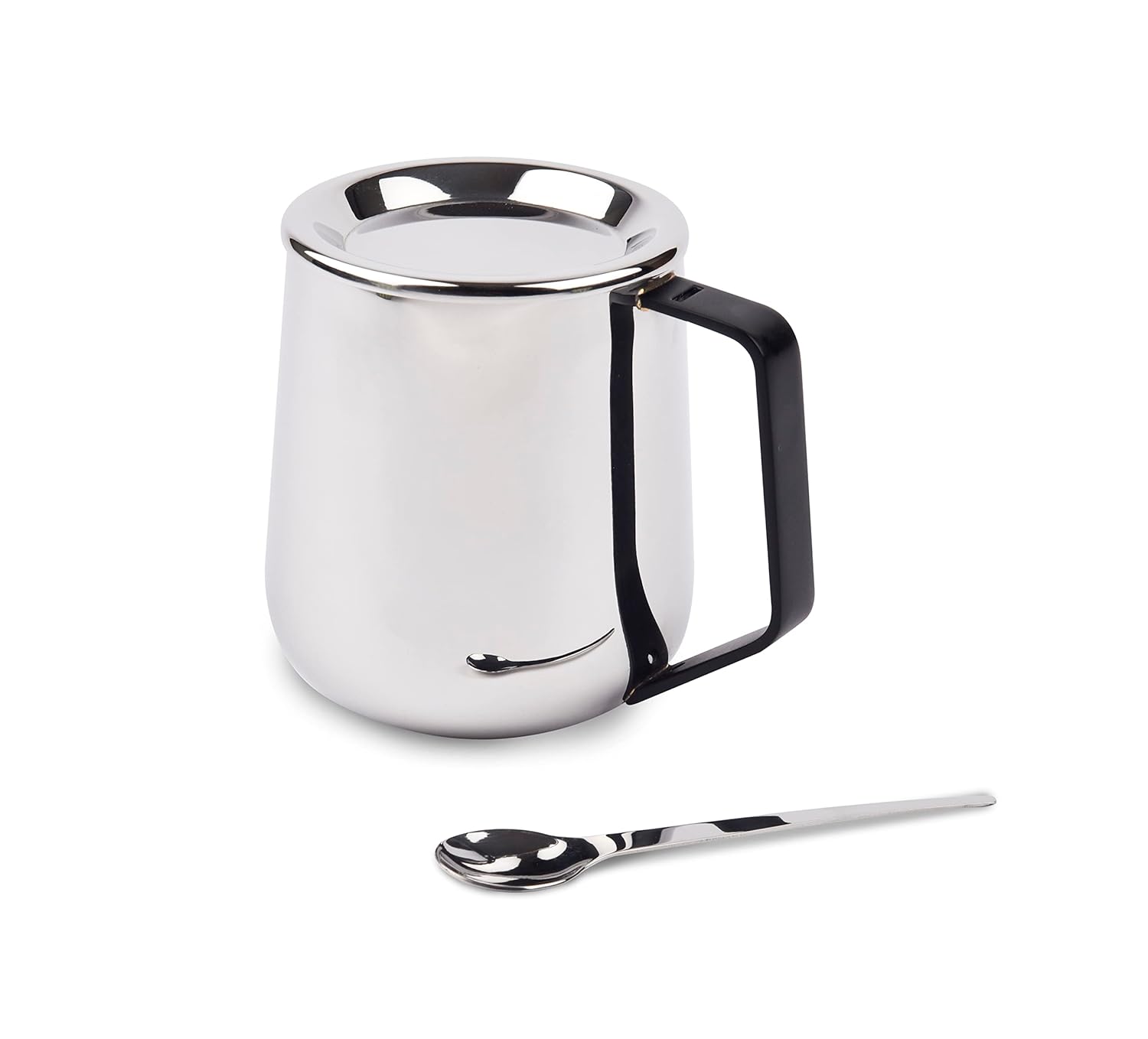 Stainless Steel Mug With Spoon & Lid, Chrome & Black | Morning Drinking Cup | Ideal For Hot & Cold Drinks | Serve Ware & Tableware | Dishwasher Safe | Bliss Series