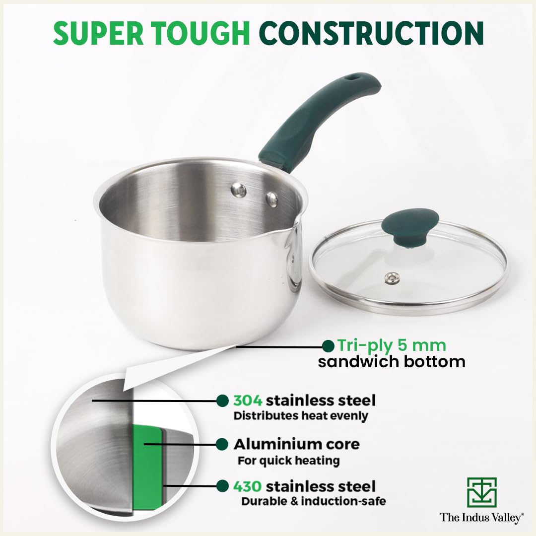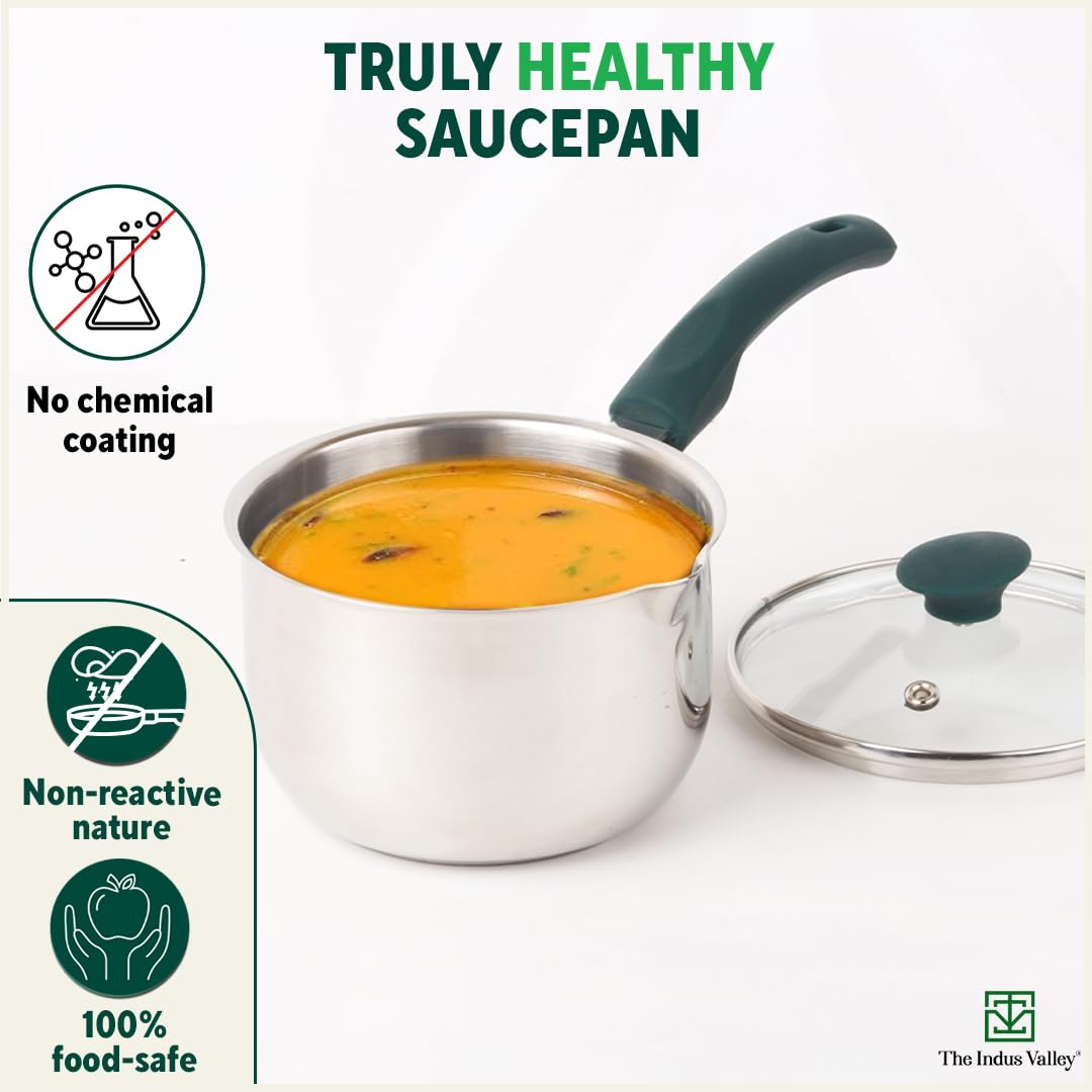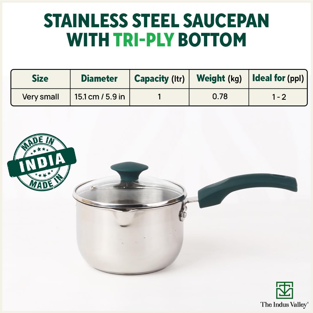 Stainless Steel Sauce Pan Or Milk Pan With Glass Lid | Very Small, 15.1cm, 5.9 Inch, 1 Liter, 0.8 Kg | Induction Friendly | 3-layer Bottom, 100% Toxin-free, Naturally Non-stick, Long Lasting