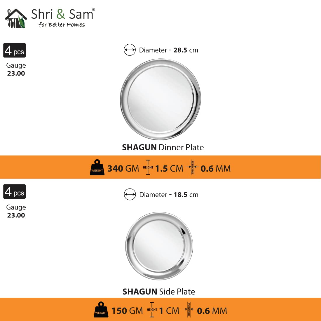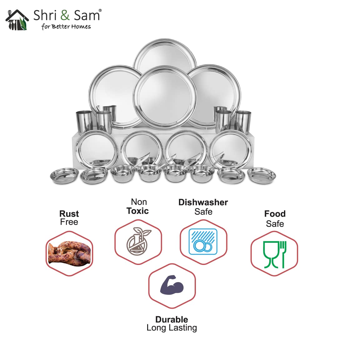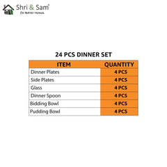 Stainless Steel Shagun Solid Dinner Set Of 24 Pcs, Silver | 4 Dinner Plates+ 4 Side Plates+ 4 Glasses+ 4 Dinner Spoon+ 4 Bidding Bowl+ 4 Pudding Bowl