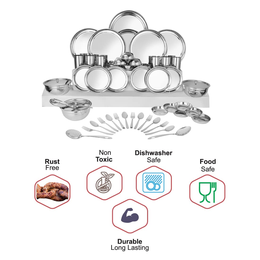 Stainless Steel Shagun Solid Dinner Set Of 51 Pcs, Silver | Dishwasher Safe