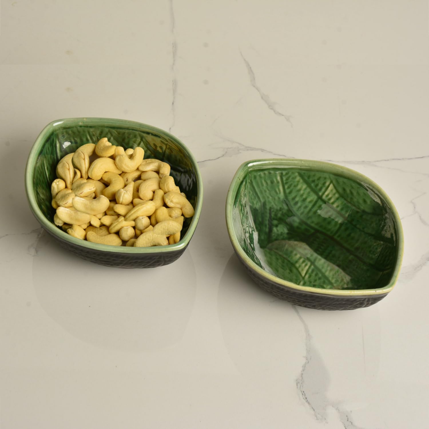 Studio Pottery Almond Shaped Ceramic Nut Bowls Set Of 2 | 450ml Each, Green & Black | Cookies, Dry Fruits, Sweets, Snack Serving Bowls | Party Bowls