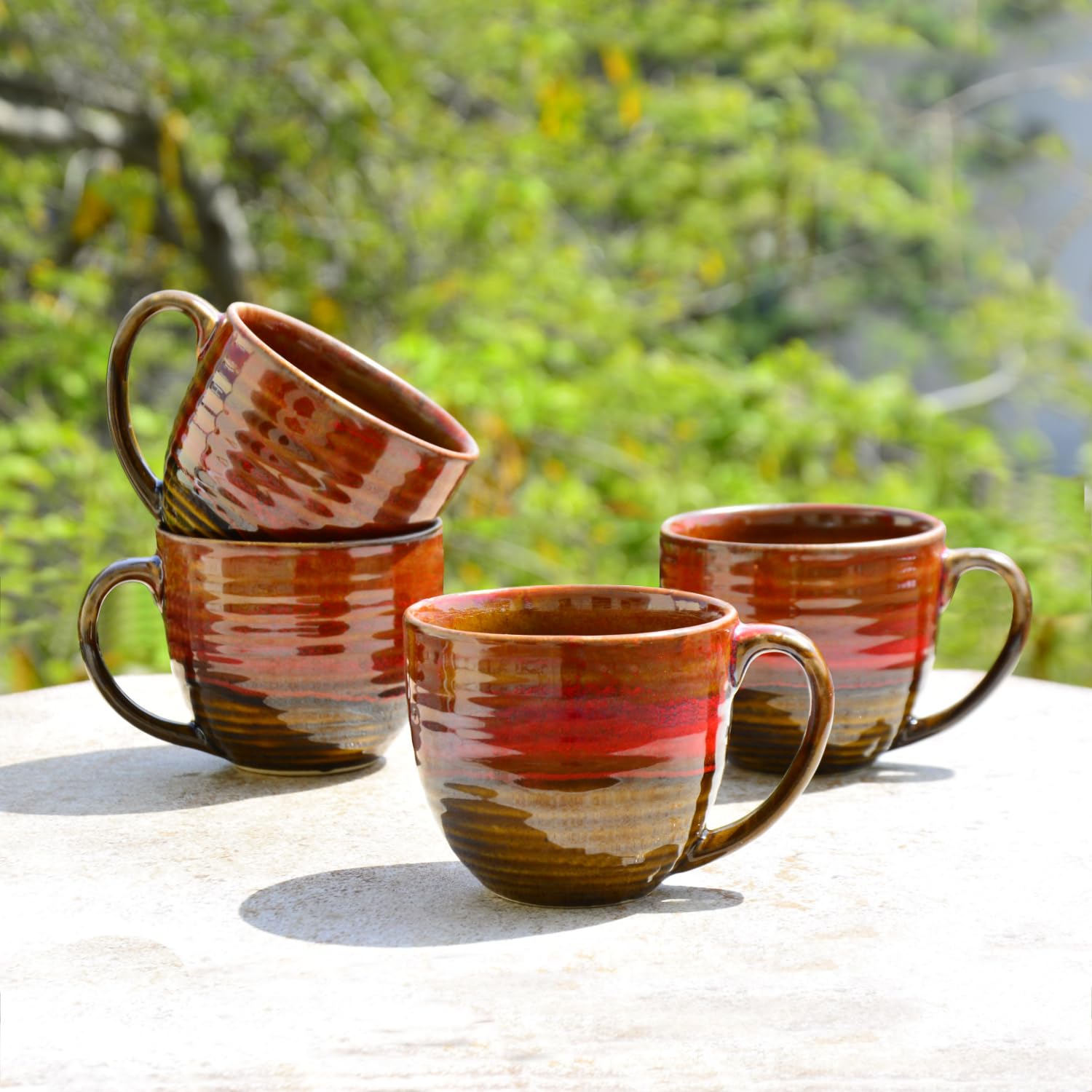 Studio Pottery Ceramic Soup Cups With Handle Set Of 4 - 350ml, Ombre Red | Maggi Bowls | Cereal Bowls