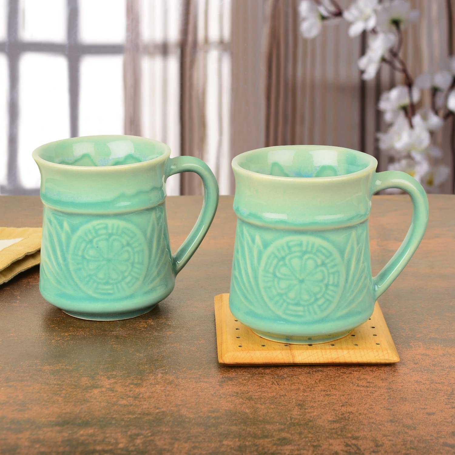 Studio Pottery Etched Ceramic Coffee Mugs Set Of 2 - 300ml Each, Turquoise | Milk Mugs | Tea Cups & Mugs