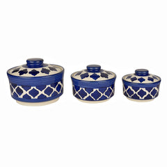 Studio Pottery Hand Painted Ceramic Serving Donga With Lid Casserole Set Of 3 - 900ml, 500ml & 300ml, Blue | Dinner Serving Set | Stackable Kitchen Bowl Set