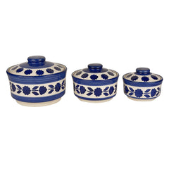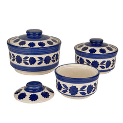 Studio Pottery Hand Painted Ceramic Serving Donga With Lid Casserole Set Of 3 - 900ml, 500ml & 300ml, White & Blue | Dinner Serving Set | Stackable Kitchen Bowl Set