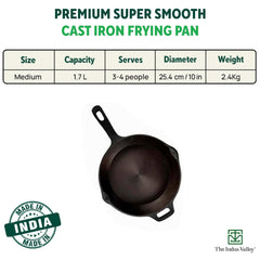Super Smooth Black Cast Iron Skillet Fry Pan With Free Wooden Spatula | Medium, 25.4cm, 10 Inch, 1.7 Liters, 2.4 Kg | Induction Friendly | Naturally Nonstick, 100% Toxin Free, No Chemical Coating