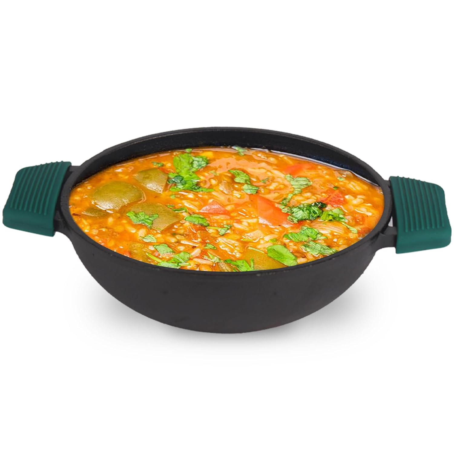 This pack contains: Cast iron kadai 10 Inch, weight 2.4 kg with silicon grip, Convenient handle for easy holding