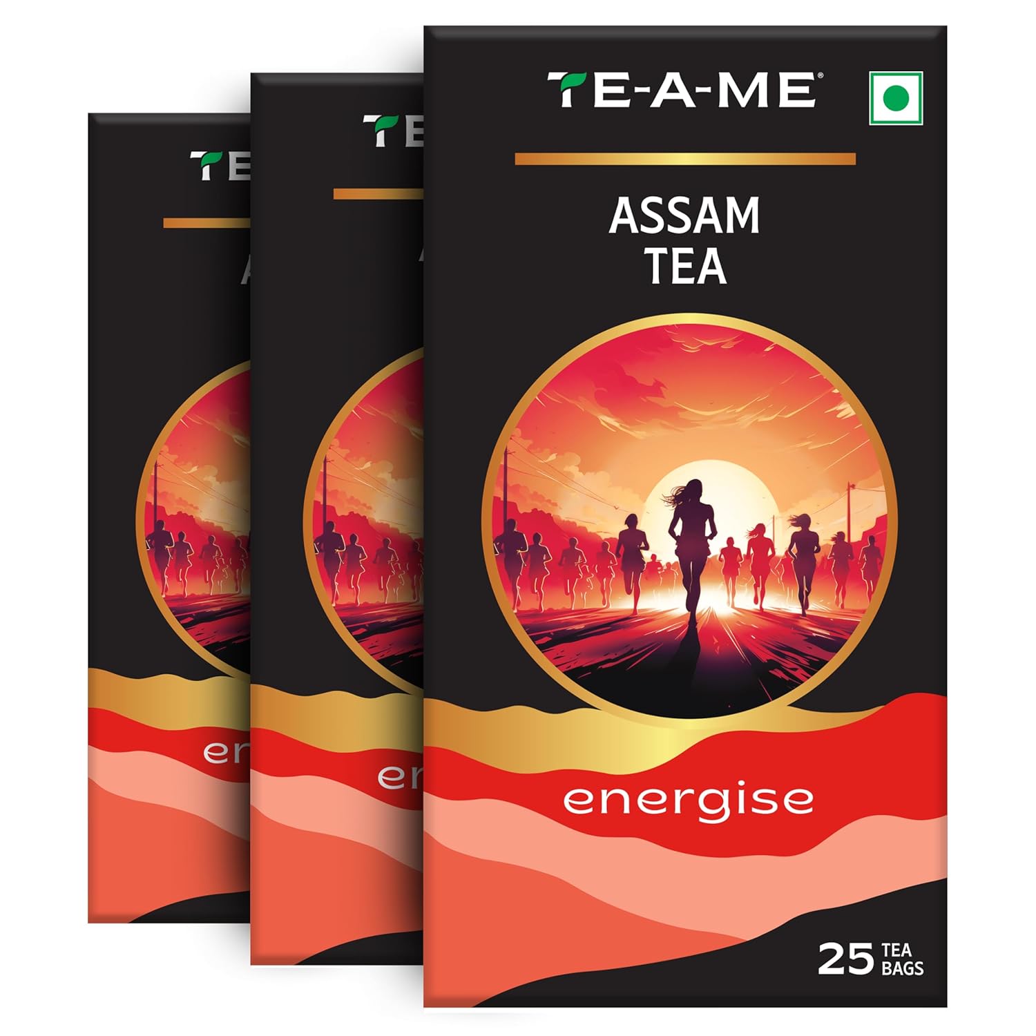TE-A-ME Energise Assam Tea - Pack Of 3 X 25 Tea Bags | Rich & Robust Flavor, Full-Bodied & Strong Tea - Premium Black Tea | Medium Caffeine, Non-GMO, Gluten Free - Packaging Might Vary