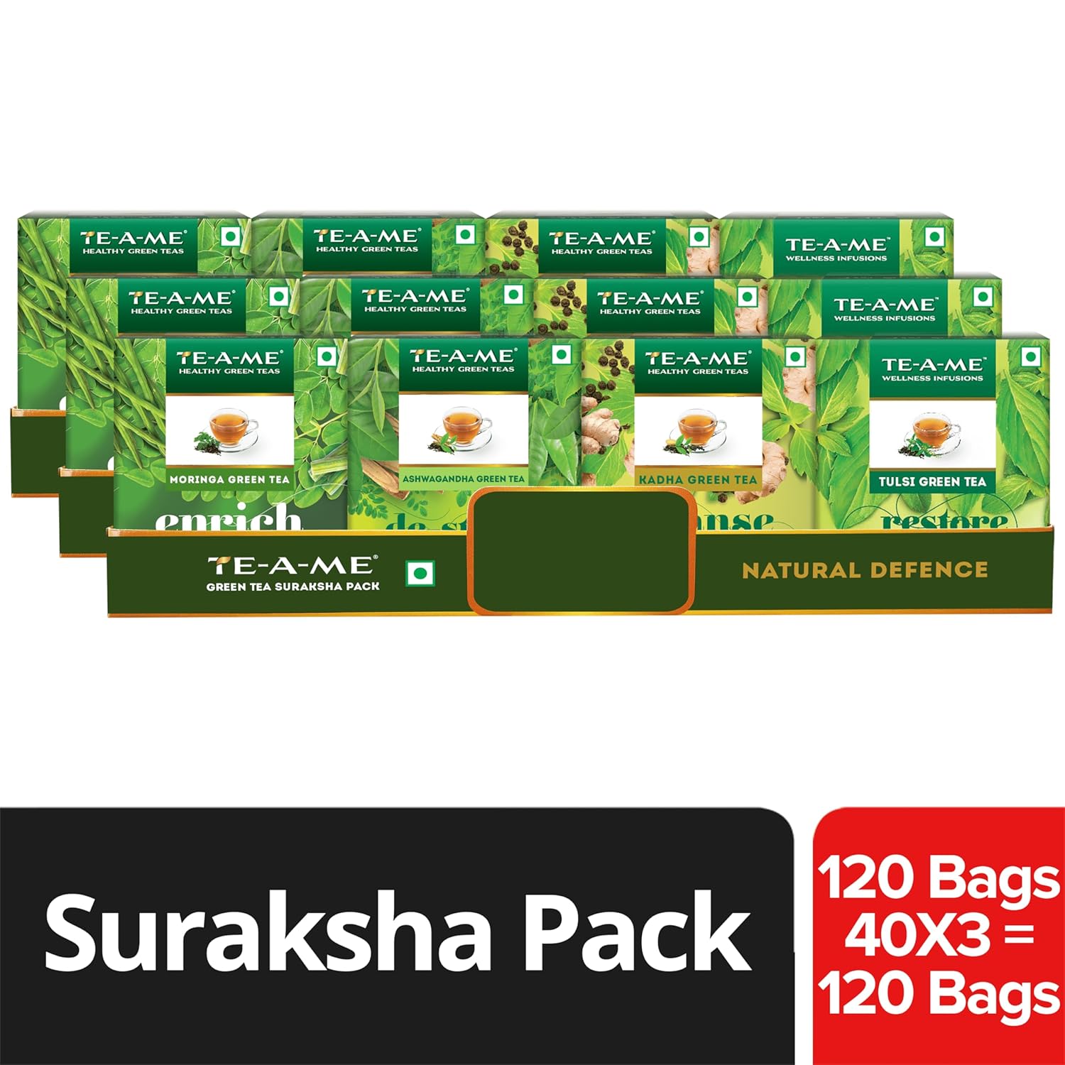 TE-A-ME Green Tea Suraksha Pack - 3 Boxes X 40 Tea Bags | Moringa+ Ashwagandha+ Kadha+ Tulsi Green Tea - Detox Green Tea & Slimming