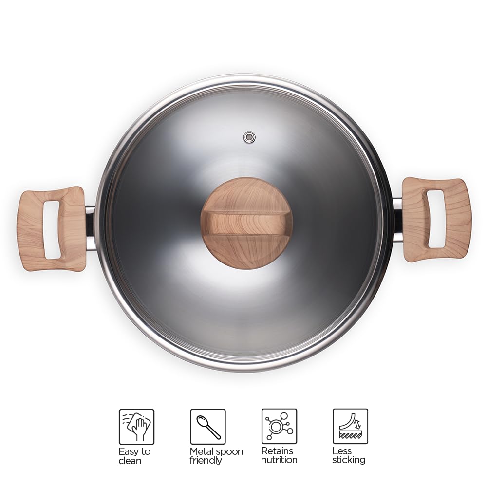 Timber Stainless Steel Triply Kadhai With Glass Lid | 24 Cm, 2.7 Liters | Wood Finished Handle | Gas & Induction Base