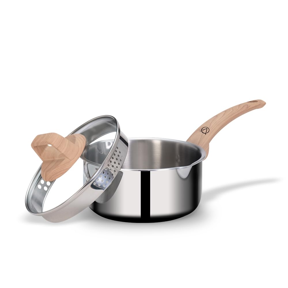 Timber Stainless Steel Triply Saucepan With Glass Lid | 16 Cm, 1.5 Liters | Wood Finished Handle | Gas & Induction Base