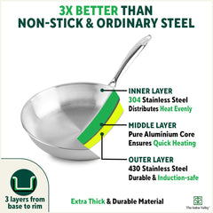 THREE-PLY CONSTRUCTION: With 3 layers of metals, from base to rim, the fry pan gives superior cooking experience than normal steel pans. It has a scratch and rust resistant surface. No worries about dents or bulging.