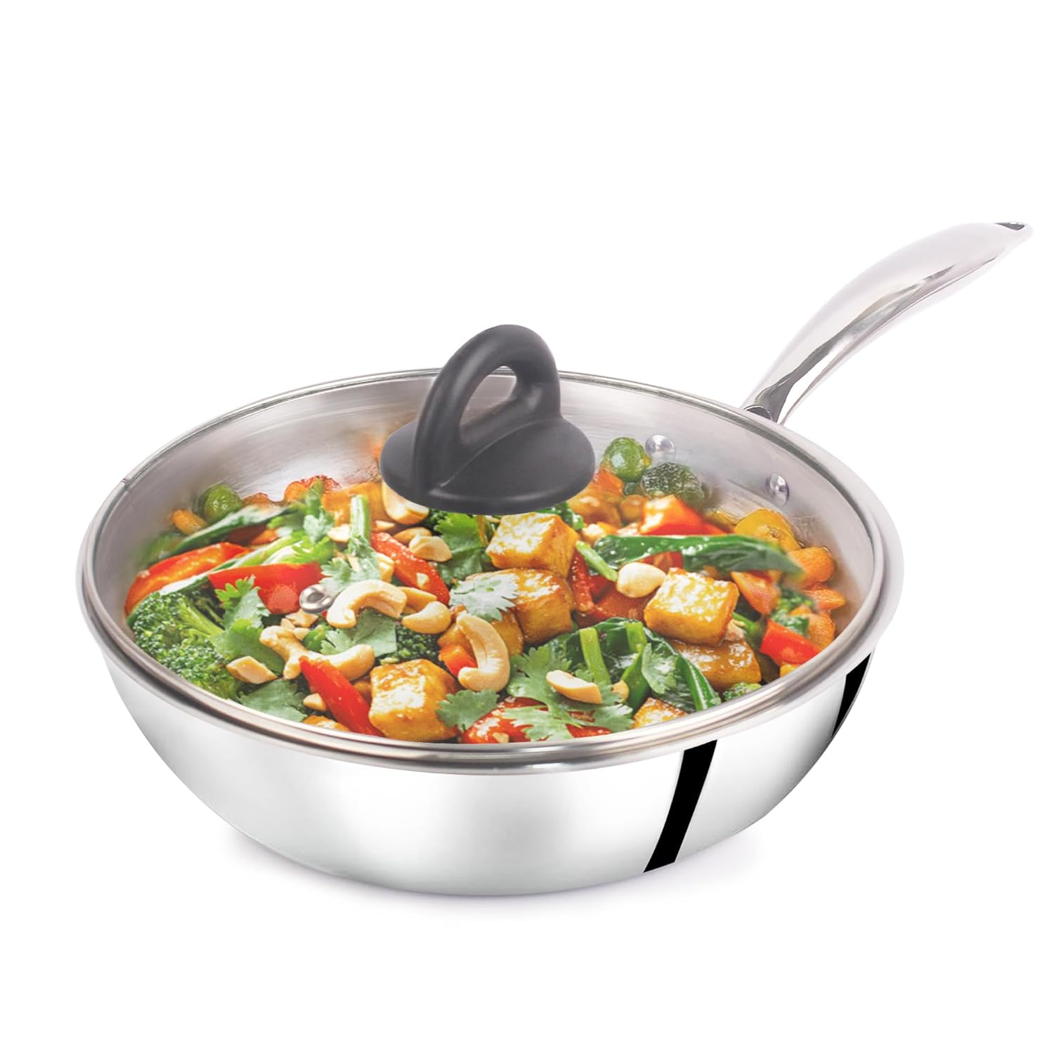 Triply Stainless Steel Fry Pan With Glass Lid For 3-4 People | Large 26cm, 10.2 Inch, 1.9 Liters, 1.1kg | Induction-friendly | Nonstick 3-layer Body, 100% Pure & Toxin-free