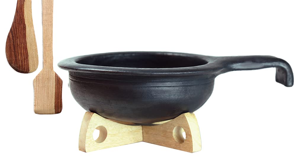 Uncoated Clay Fry Pan For Cooking & Serving With 2 Wooden Spatulas Complimentary - Black, 1 Liter | Pre-seasoned Mud Vessel - Unglazed, Double Fired, Hand Crafted | Mitti Tadka Pan