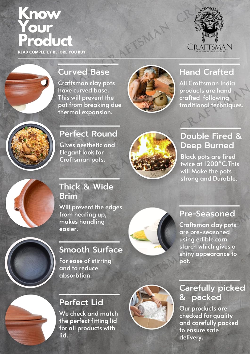 KNOW YOUR PRODUCT- It is hand a hand made product, Size and shape may slightly vary. More sand added in clay for Extra Strength, Durability and Long lasting, Rough finish. SEASONED- This product is seasoned using Corn Starch. Seasoning starch may appear Glossy and Slippery on surface. BLACK POTTERY_ Pots attain Black colour naturally during DEEP BURNING process due to temperature change in the kiln.