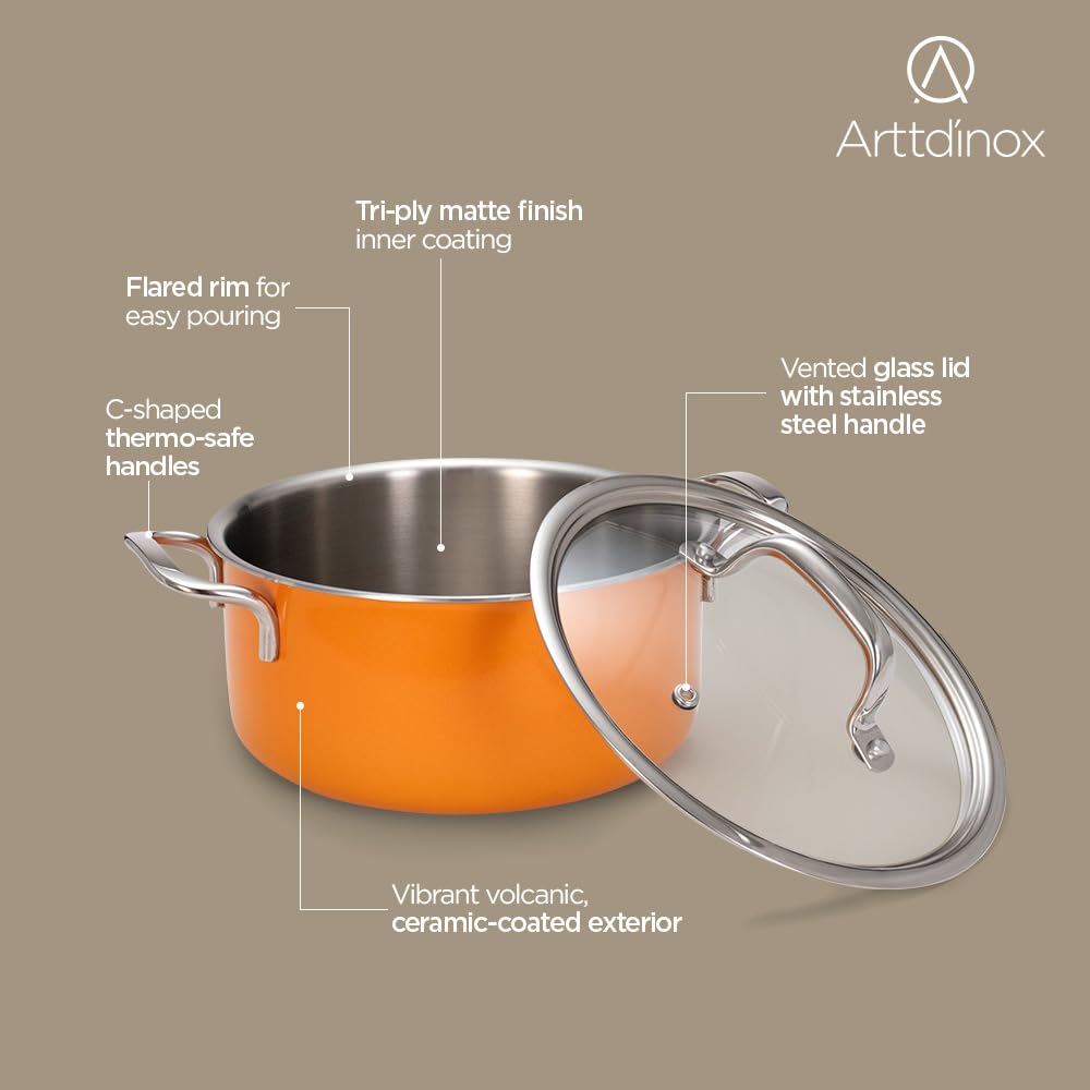 Vida Stainless Steel Triply Pot With Glass Lid | For Biryani, Pulao, Halwa, Curries | 20 Cm, 3 Liters | Rivet Less Handle | Induction & Gas Base | 7 Yrs Warranty, Volcanic Color
