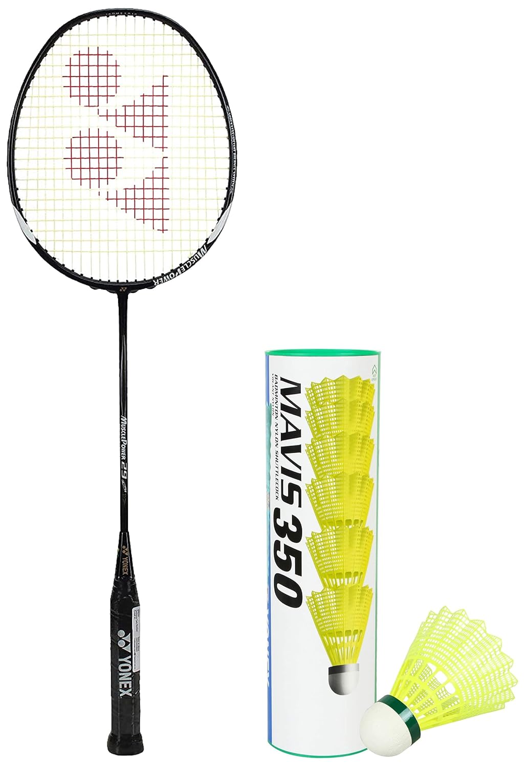 Yonex Graphite Badminton Racquet MUSCLE POWER 29LIGHT Black Grey G4, 89.9 Grams, 30 Lbs Tension + MAVIS 350 Green Cap Nylon Shuttlecock, Colour - Yellow